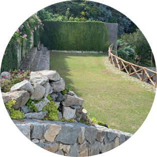 Casa abierta con una extraordinaria vista sobre el mar y las montañas, donde se puede desarrollar cualquier tipo de evento. Espacio conformado por 2 áreas externas. La parte frontal y lateral de la casa de 263 mts2, con un suelo empedrado y muros de piedras. La segunda área contenida por una hermosa muralla, llena de coloridas plantas (tarima natural de 226 mts2). En su conjunto, se pueden desarrollar eventos para aproximadamente 340 personas.
